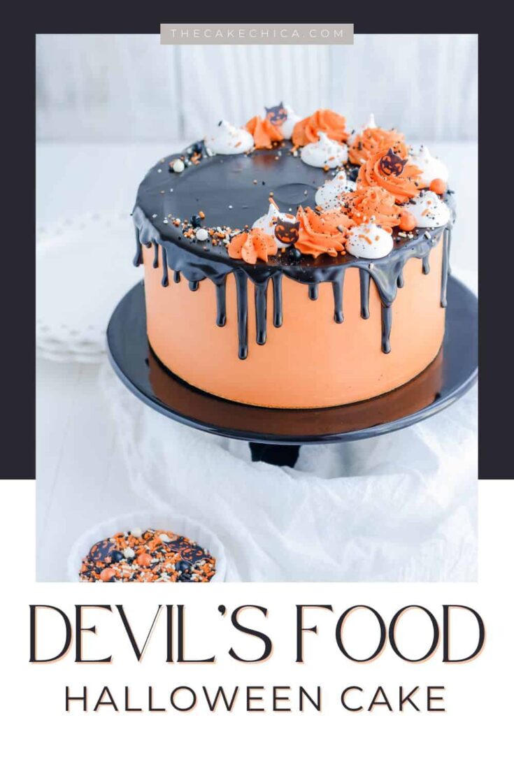 To celebrate the upcoming holiday I created this festive and tasty Devil’s Food Halloween Cake made with dark chocolate cake layers, filled with marshmallow filling, and frosted with bakery-style frosting and black chocolate drip.